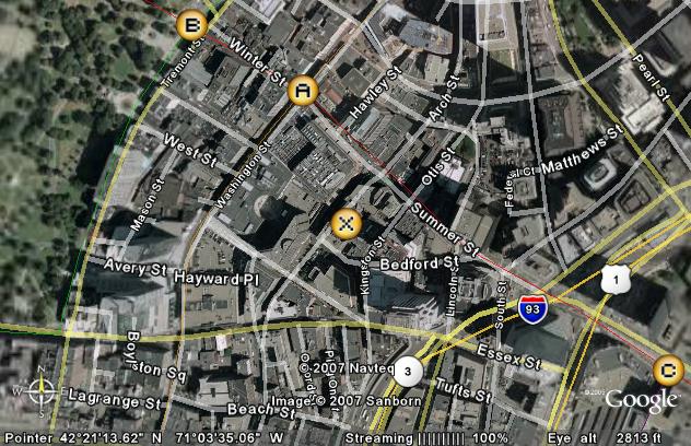 Birger Engineering is located near the corner of Chauncy and Summer Streets (marked X, on the aerial view).